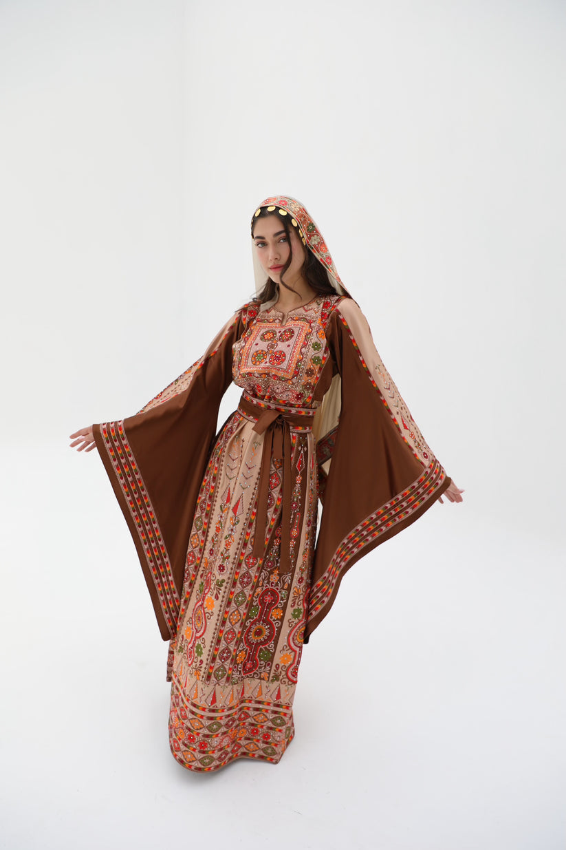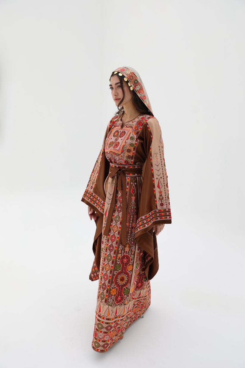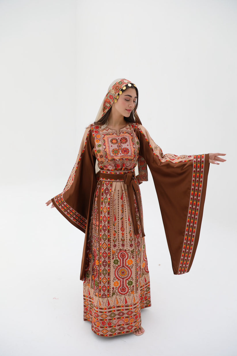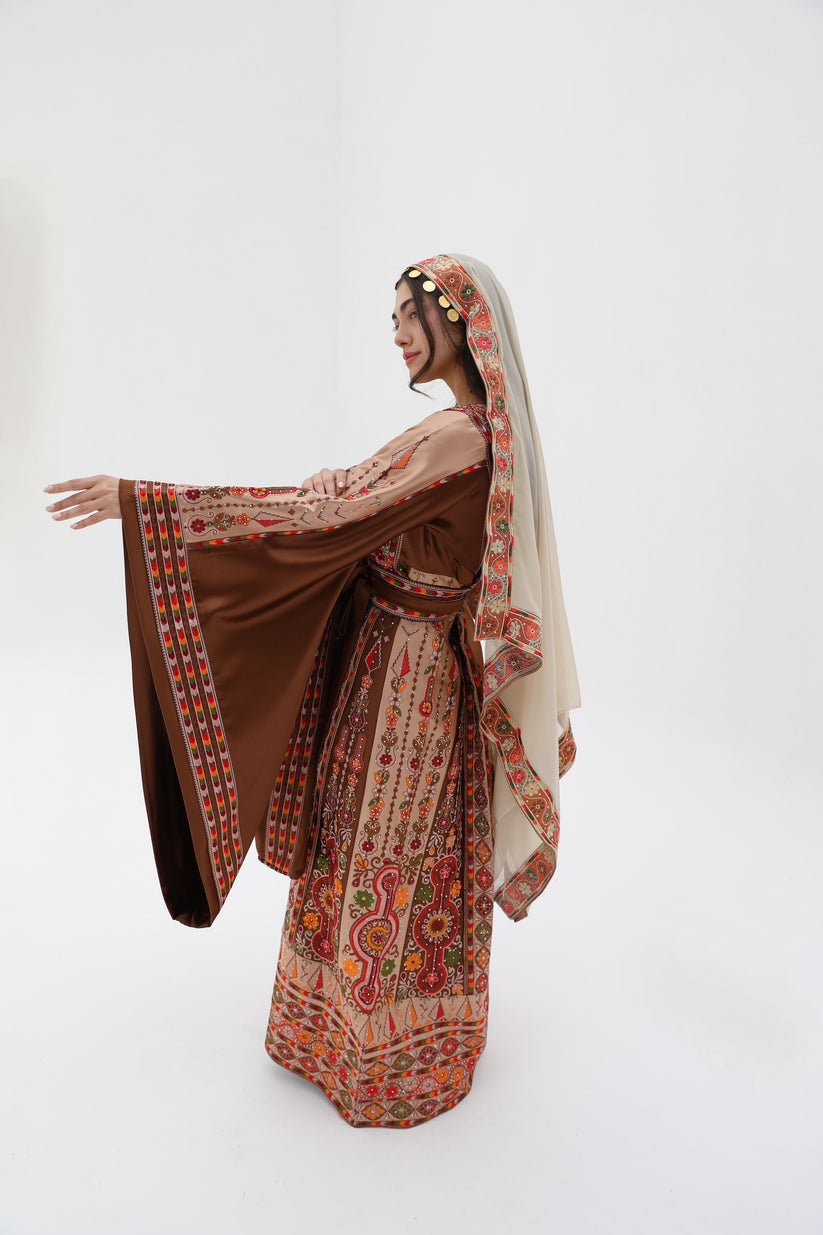 The thobe features a warm ivory (golden-toned) base covered with rich tatreez embroidery in red, orange, green, and earthy accents. Dense patterns define the chest panel and run down the front with bold, heritage motifs, finished with a detailed embroidered hem. Deep brown outer panels and wide flowing sleeves frame the look, with embroidered borders along the sleeve edges. A matching brown waist tie adds structure, while the long, full-length silhouette stays classic and statement-ready.