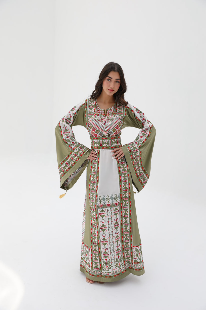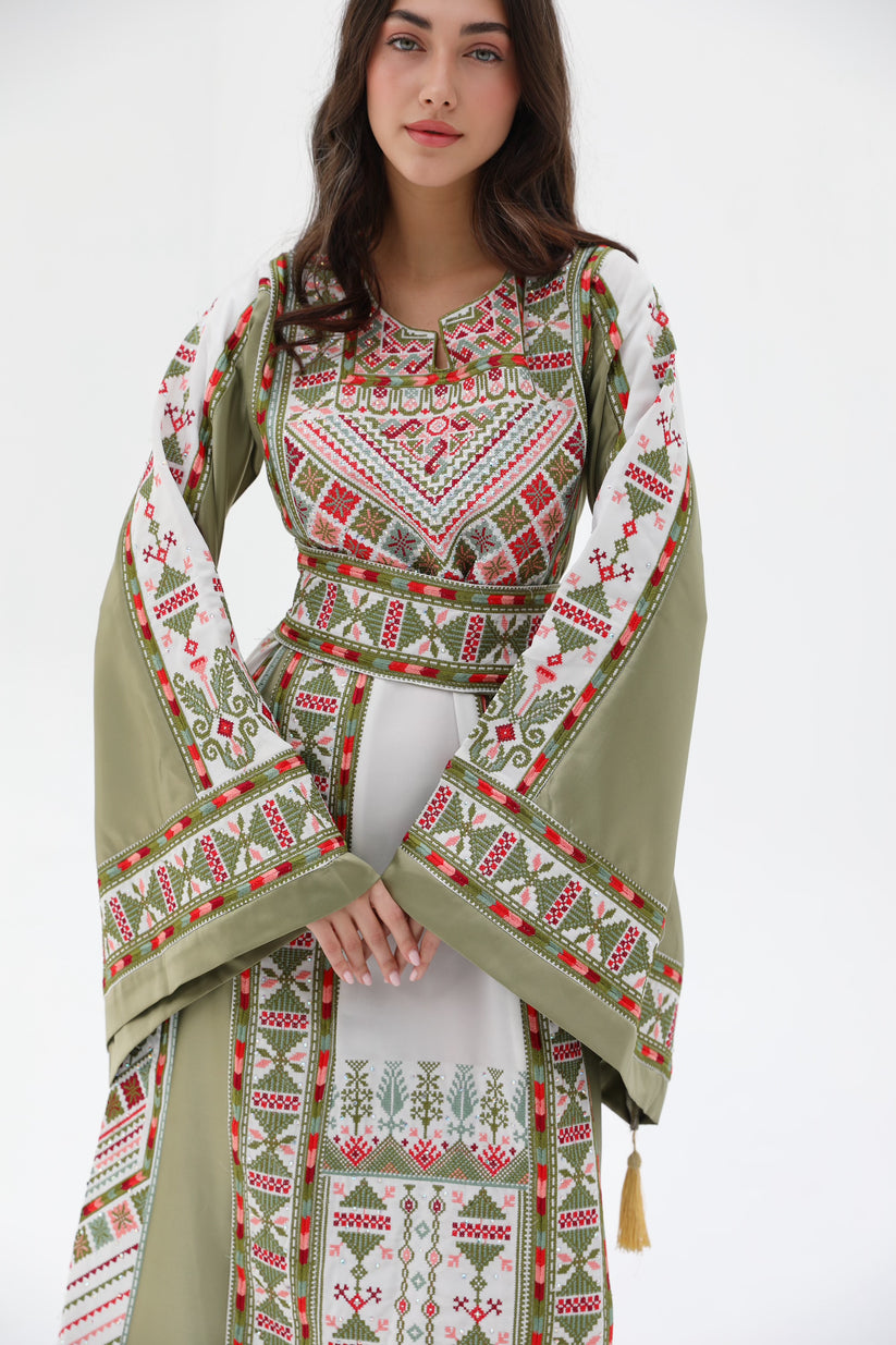 The thobe features a rich olive-green base paired with soft beige panels and detailed tatreez embroidery. Traditional geometric patterns decorate the chest and run vertically along the front borders, while embroidered sleeve accents add structure and depth. The contrast between green and beige creates a grounded yet contemporary look that reflects both heritage and modernity. The long, full-length silhouette remains classic and comfortable, suited for cultural and formal occasions.
